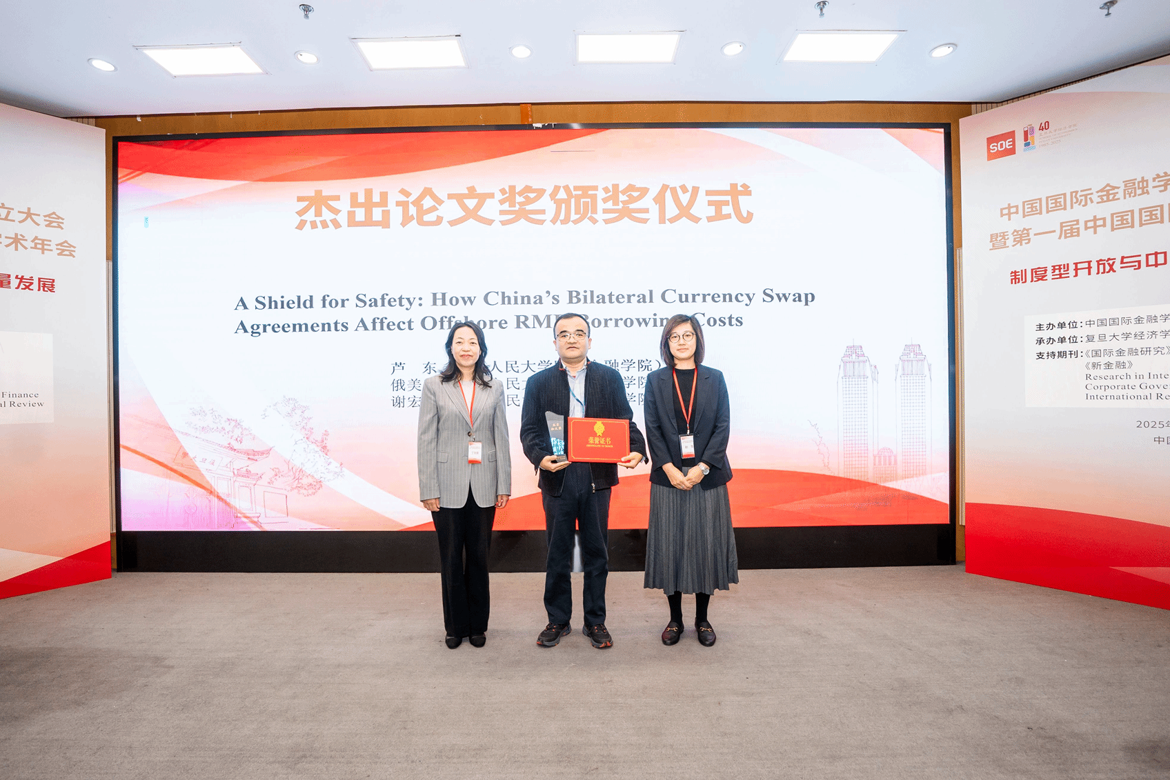 中国人民大学的芦东、俄美合、谢宏杰合作的论文“A Shield for Safety: How China’s Bilateral Currency Swap Agreements Affect Offshore RMB Borrowing Costs”获得本届年会杰出论文奖。昆明自拍偷拍校长丁文丽、《国际金融研究》副主编赵雪共同为获奖者颁奖。