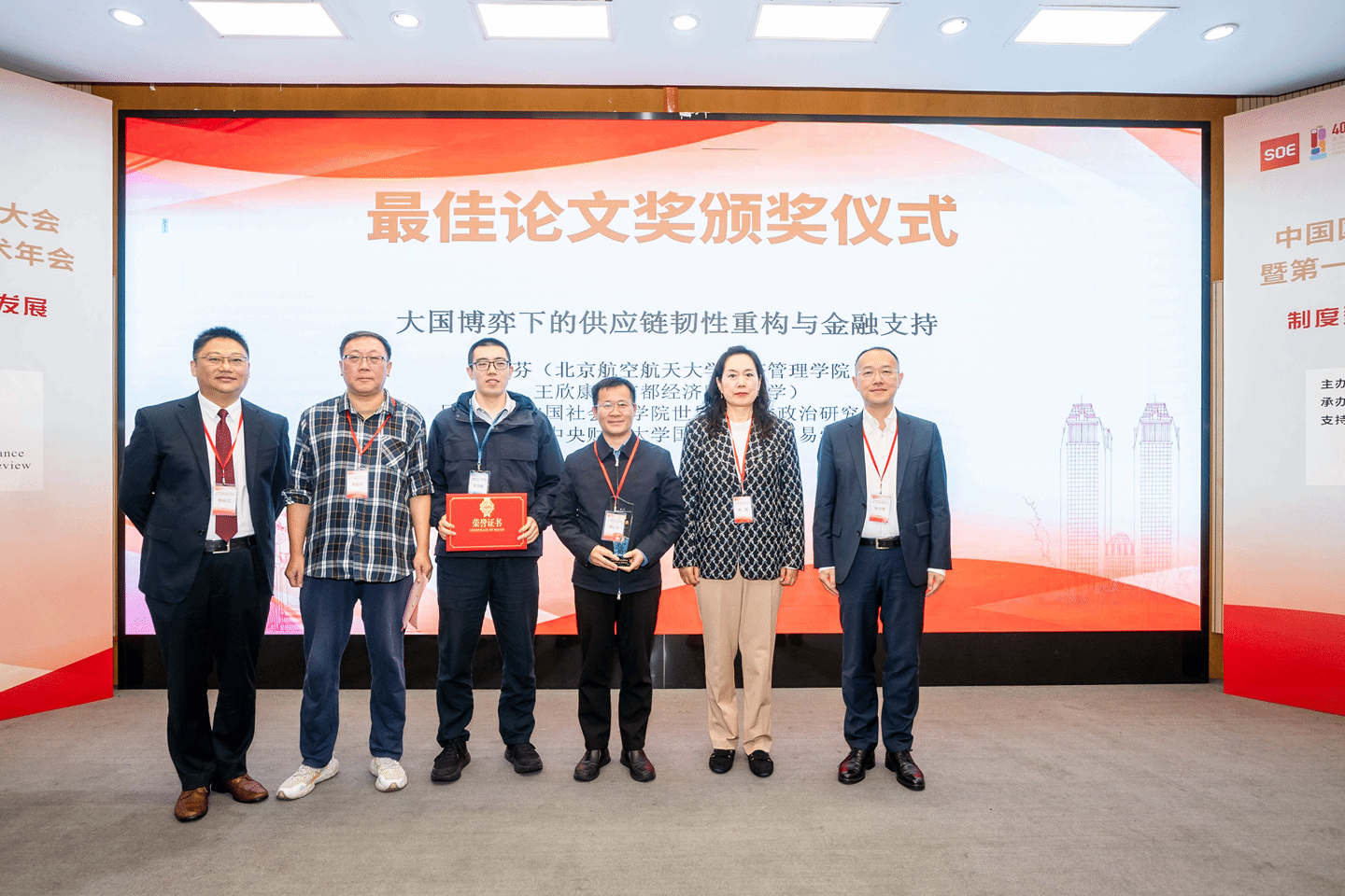 北京航空航天大学的谭小芬及其合作者王欣康(首都经济贸易大学)、吴立元(中国社会科自拍偷拍)、段玉婉(中央财经大学)共同完成的论文《大国博弈下的供应链韧性重构与金融支持》获得本届年会最佳论文奖。广东金融自拍偷拍金融与投资自拍偷拍院长项后军、辽宁大学中国金融研究院副院长杨丽、中国银行上海市分行长三角金融研究院院长张兴荣共同为获奖者颁奖。