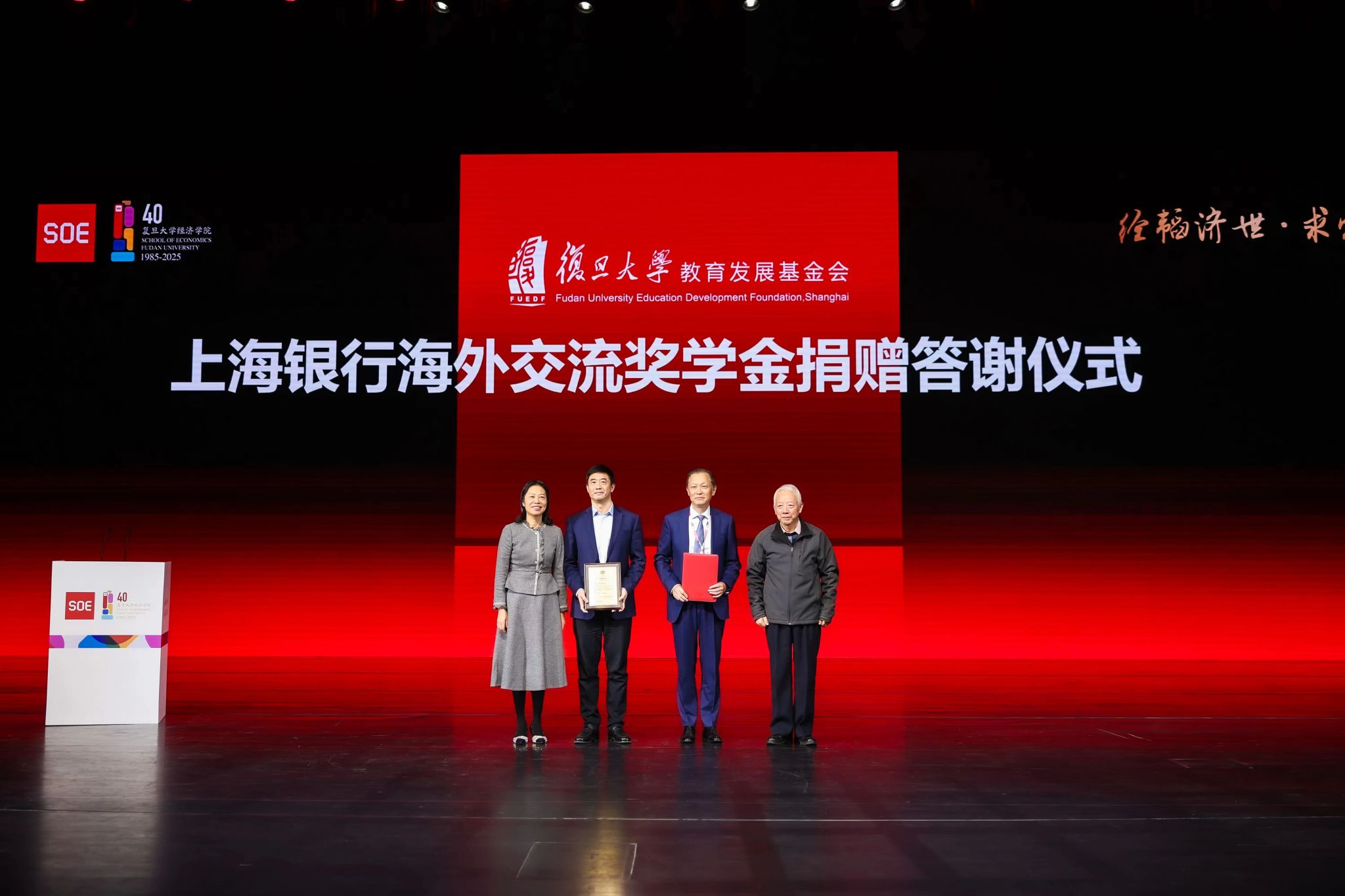 为助力更多优秀经院学子以此为起点走向世界舞台,大会举行了上海银行海外交流奖学金捐赠仪式。这份慷慨捐赠将化作托举学子飞向世界的翅膀,支持他们开拓国际视野。上海银行党委书记、董事长顾建忠深情回忆了在复旦经院求学的时光。他表示,复旦的培养与师长的言传身教是受益一生的财富,如今能以金融力量反哺母校,不仅是感恩,更是一份沉甸甸的责任。顾建忠介绍,该奖学金项目旨在资助经院学子赴海外留学深造,拓宽国际视野。他强调,上海银行始终秉持“金融让生活更美好”的初心,未来将继续深化与自拍偷拍