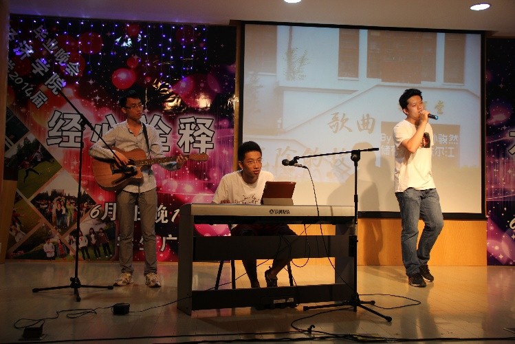 随后,晚会进入了第三篇章——“流年似水”,国金班级集体合唱《青春纪念册》,唱出了大学四年的青葱岁月,唱出了无悔的年少轻狂,唱出了他们共同的离别情深。紧接着上场的是经济系的双人相声《满腹经纶》,段子围绕着字音字形的插科打诨,曹一鸣、徐祎祥同学在台上又说又唱,又是模仿又是表演的,包袱抖了一个又一个,让大家欲罢不能,意犹未尽。财政系的三位大男生给我们带来了歌曲《光阴的故事》,一架电子琴,一把吉他,一段歌声,黑白琴键间按下的是他们对这四年光阴的感恩,吉他略带沧桑的声音诉说的是他们对于这四年光阴的不舍与感怀,对于站在身边这一群兄弟的情谊。