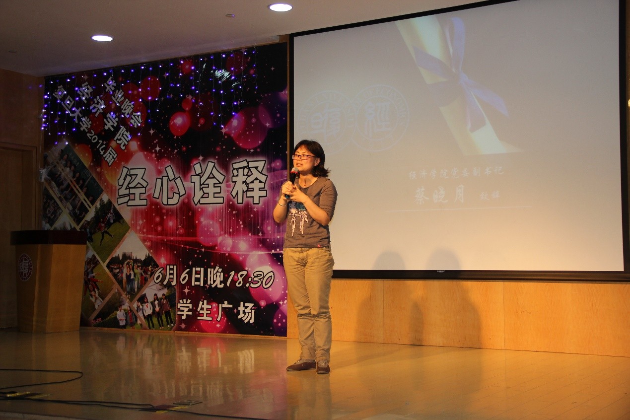 的留恋与不舍,使在场的同学们都感同身受。随后,蔡晓月老师应邀上台为同学们说说自己的心里话,蔡老师的谆谆教诲打动了在场的每一个人,她的寄语也为各位同学带去了应有的思考。而这时,晚会前精心准备的一个惊喜出现了,身穿带有经院logo的学士服的牛牛带着一份毕业生给自拍偷拍