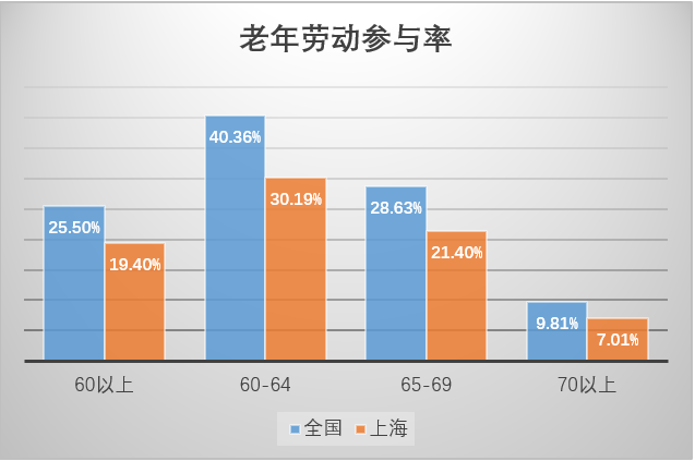 其次,上海老年群体的平均受教育程度较高,养老需求也比较高。例如,2015年全国1%人口抽样调查数据(俗称“小普查”)显示,上海60岁及以上人口中,高中及以上学历占比为15.10%,大专及以上学历占比为8.30%,高于全国同期的10.58%和5.45%。高教育程度老人对精神和文化层面的需求和“老有所乐”的活力养老提出了较高要求。另一方面,随着教育水平和收入水平提高,老年疾病谱已经发生变化。研究表明,老人的日常行为能力指标随着时代变化逐步改善,但高血压、超重等慢性病和健康风险却在逐步增加,这就对健康管理提出更高要求。第三,上海老年群体的劳动参与率低于全国水平。总体上看,60岁及以上人口的劳动参与率,上海比全国低6个百分点,在60-64岁组中差距最为明显,二者相差10个百分点(图2)。上海老年劳动参与率较低的一个重要原因是职工养老保险覆盖率较高,受退休年龄制度制约更多,由此,中老年劳动力退出劳动力市场更早。这也表明,延迟退休年龄政策对增加劳动力供给的效果在上海将会更为明显。