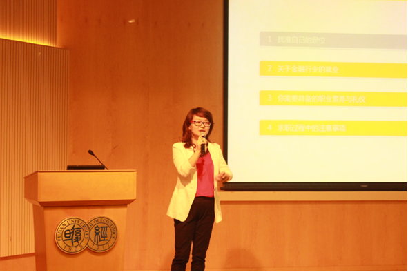 105大金报告厅,汇添富基金管理有限公司行政支持部总监、人力资源总监王静校友为专业学位研究生班级的同学们主讲了一场关于职业素养的讲座,主题为“为明天做好准备——谈金融行业的就业”。
