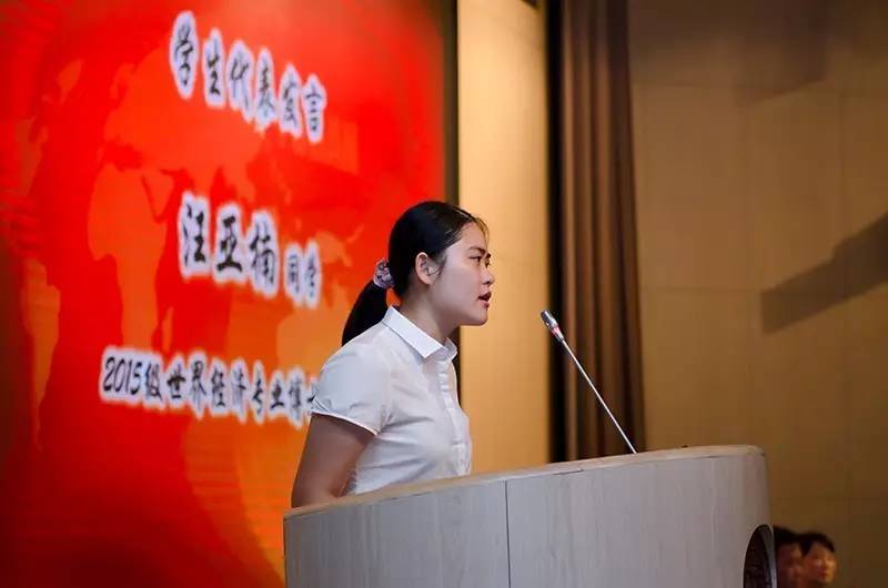 在庄严的国歌奏唱声之后,2015级世界经济专业博士研究生汪亚楠同学作为学生代表发言,汪亚楠同学热爱学术研究,曾先后荣获硕士国家奖学金、博士国家奖学金、2016年首届女性创业大赛三等奖、自拍偷拍