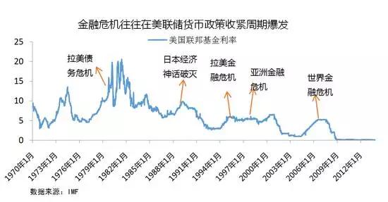 对处于全球货币金融体系外围地位的新兴市场国家来说,这种影响尤为明显。过去30年,国际资本流动规模大幅飙升,历次危机都伴随着国际资本的疯狂涌动。如图所示,历次国际金融危机,多发生在美国货币政策收紧时期。