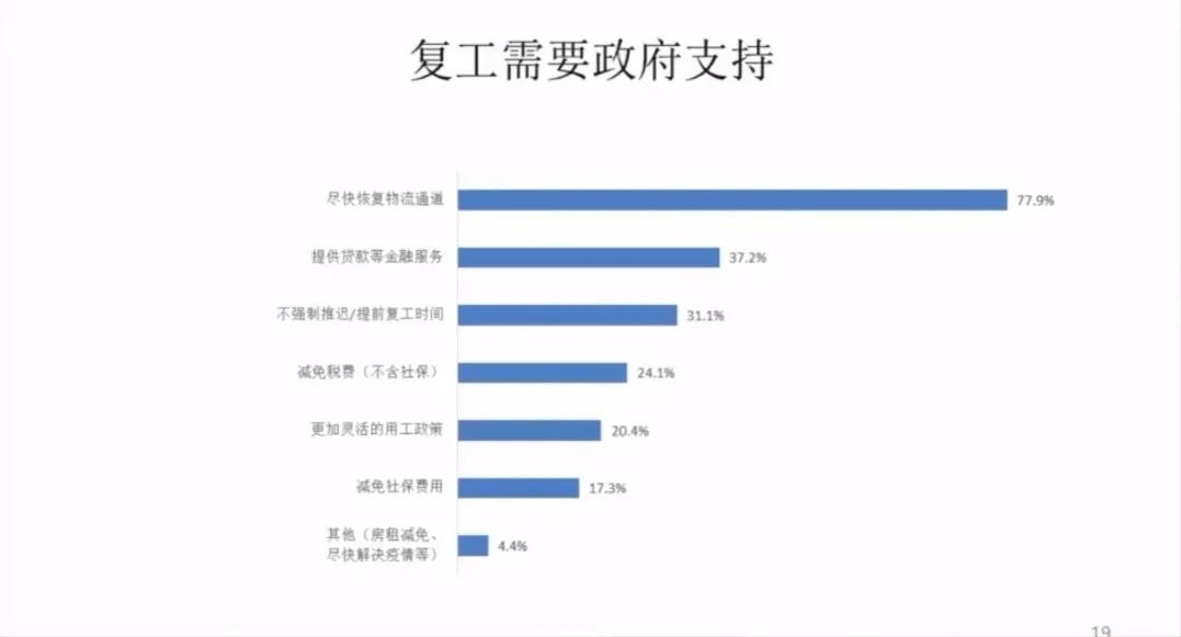 我们做了近万家的企业调研发现,复工难的原因从供给来说还是物流、人流、交通流不通占了60.7%,这是总供给的问题。因为疫情,政府希望延期复工占17.6%,也有36.9%的企业,担心复工以后又产生新的疫情扩散;员工无法按时返岗,占到31.2%。