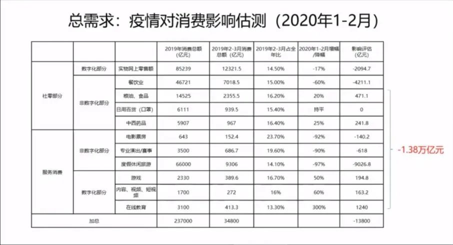 从整体结构角度来看,可以看到整个的影响。社会零售数字还会减少2000多亿,餐饮会下降4000多亿,旅游休假会下降9000多亿。和上升的线上教育、短视频、游戏相抵的话,估计在今年1月到2月,疫情对消费的总影响是1.38万亿人民币。