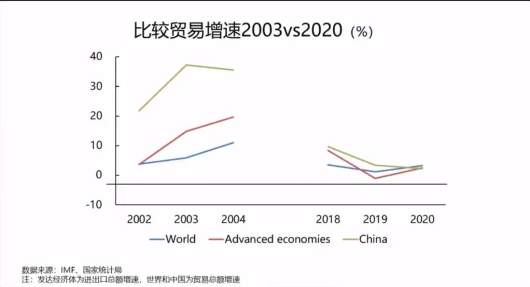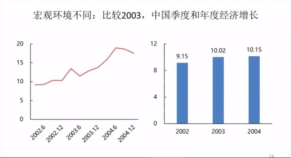 所以我们把这几个数据放在一起看,疫情在2003年有一个强劲的反弹。消费是一个比较困难的方面,靠投资、靠房地产、靠贸易,整个拉动。所以使得整个2003年经济继续增长,比2002年持平还继续增长。