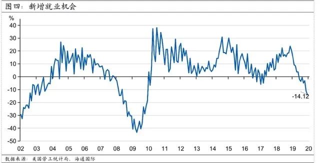 与此同时,生产和就业的数据也开始趋弱。工业生产已连续五个月下降。美国供应管理协会(ISM)制造业采购经理人指数过去18个月以来一直呈下降趋势。最新的就业机会和劳动力流动调查(JOLTS)显示,去年12月,就业市场上的非农就业机会总数从去年1月的760万峰值下降至642万。尽管这一水平仍然不低,但较去年同期下降了14%,创下2009年以来的最大跌幅(图四)。这表明就业的二阶导数已经为负。如果趋势延续,劳动力市场降温,就业和收入增长将面临挑战,消费的可持续性就值得怀疑了。