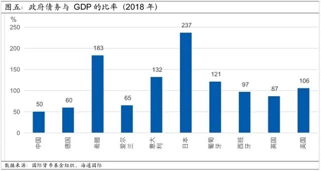 在疫情背景下,财政政策(尤其是给企业和家庭纾困的福利性政策)才是最有效的应对手段。然而,除了中国、德国等少数经济体外,全世界大部分经济体的政府债务都已不堪重负(图五)。许多经济体的政府或许有能力一次性增加财政开支来为企业和家庭纾困,但在此之上通过额外的财政支出刺激经济的空间却非常有限。诸如意大利、西班牙这种经历了上一轮欧洲主权债务危机、债务负担较重、经济增长比较疲弱、且目前已经受到新冠疫情冲击的经济体来说,搞不好会因此引发新一轮的主权债务危机。