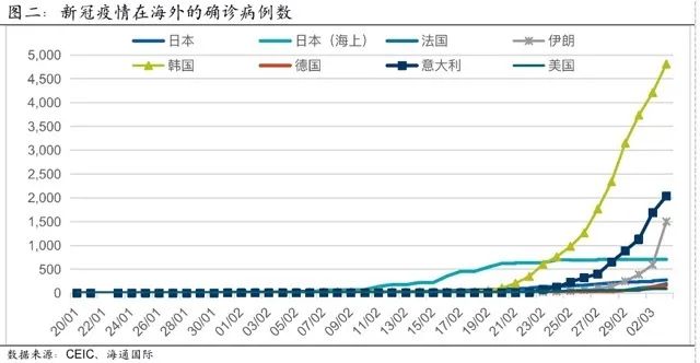 不幸的是,过去几周的疫情发展,正在验证我们的担忧。虽然中国内地的疫情防控已取得明显成效,新增确诊人数在不断下降,但海外情况却在迅速恶化。截止到3月3日发稿前,全球(大中华区除外)已确诊病例累计超过1万例,其中韩国、意大利、伊朗、法国、德国等国的确诊人数仍在快速攀升(图二);确诊国家的数量也在迅速增加,目前已有60多个国家和地区出现确诊病例,疫情有在全球扩散和失控的迹象。2月27日,世界卫生组织总干事谭德塞表示,新冠病毒有可能转变成为全球“大流行疾病”(pandemic),并把对这一风险的评估从“高”提升至“非常高”。