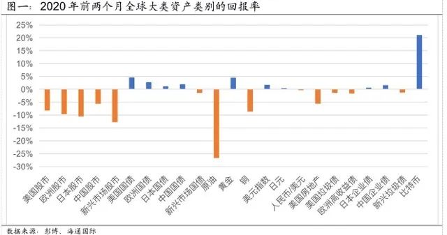 受新冠疫情在全球扩散的影响,全球金融市场近期出现了剧烈波动,绝大多数风险资产价格暴跌,一些避险资产的价格也出现大幅度波动。但整体而言,一改2019年全球风险资产与避险资产价格比翼双飞的现象,今年前两个月,风险资产价格整体下跌,而避险资产价格则普遍上扬(图一)。