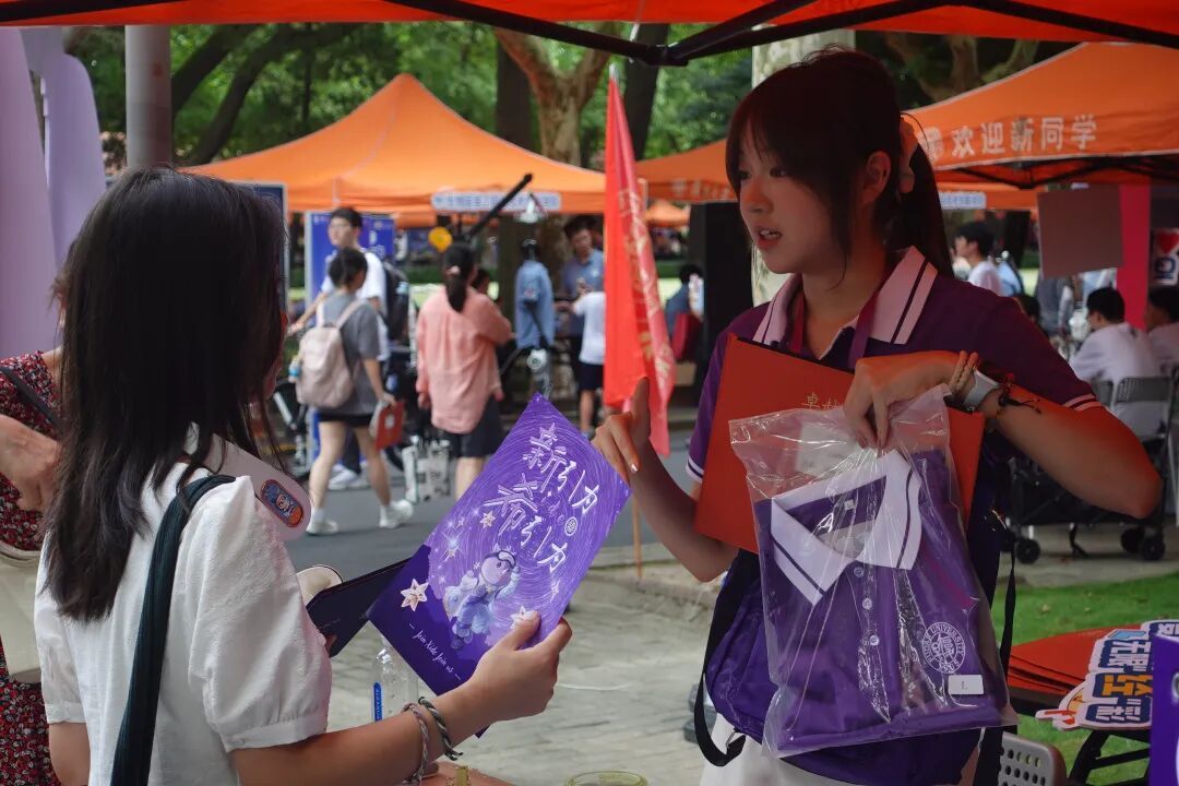 新生们来到班级迎新摊位报到
