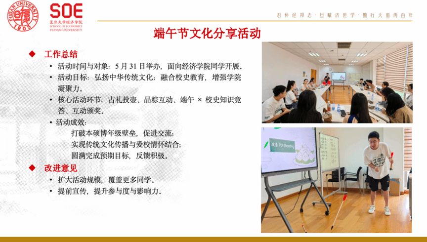 以文化交融与组织融入为重点开展工作。成功举办端午节文化分享活动,融合古礼投壶、品粽互动与校史知识竞答,弘扬传统文化,激发爱校情怀。协同举办研会迎新破冰活动,覆盖70余人,促进内部跨域交流。此外,积极参与筹办“光华韶宴”七院联谊舞会,服务约250人次,助力院系协同。